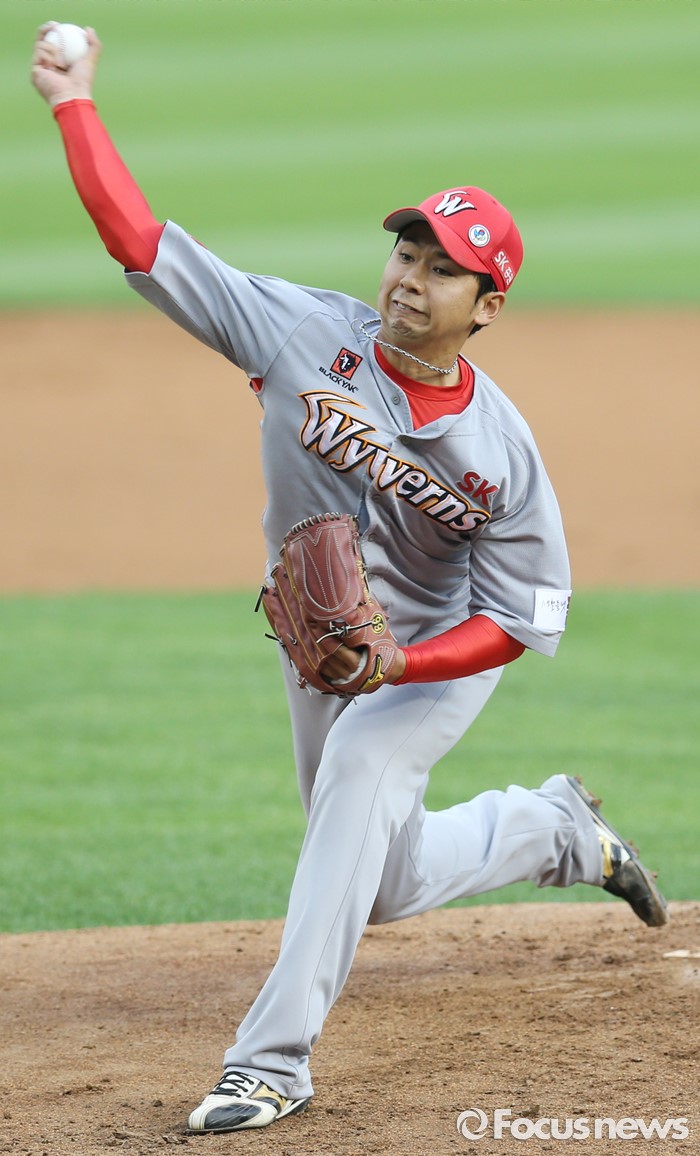 (서울=포커스뉴스) 3일 서울 잠실구장에서 열린 2016프로야구 SK-두산 경기에서 1회말 SK 선발투수 윤희상이 투구하고 있다.