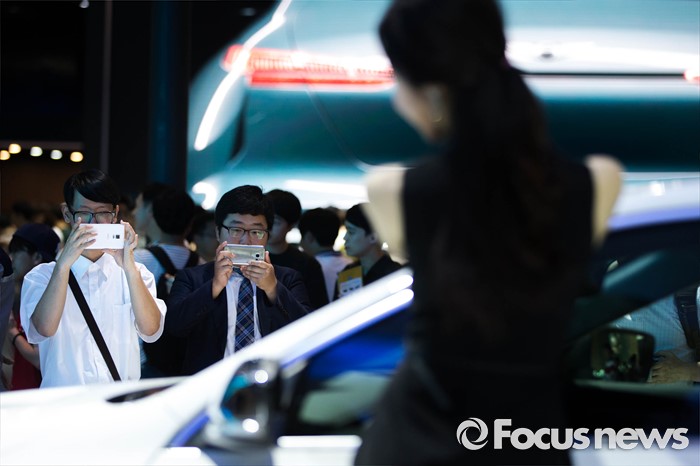 (부산=포커스뉴스) 3일 오후 부산 해운대구 벡스코에서 '2016 부산 국제모터쇼'가 공식 개막한 가운데 레이싱걸이 관람객들을 향해 포즈를 취하고 있다. 이번 국제모터쇼는 오는 12일 까지 계속 된다.