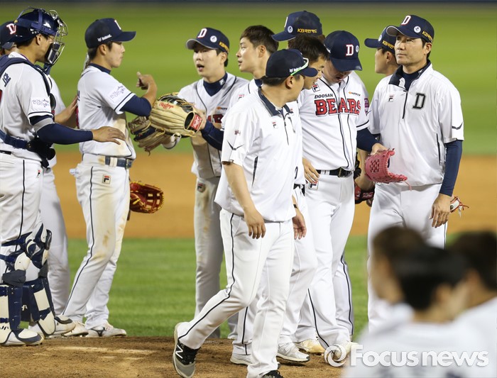(서울=포커스뉴스) 3일 서울 잠실구장에서 열린 2016프로야구 SK-두산 경기에서 SK를 물리친 두산 선수들이 마운드에 모여 승리를 자축하는 가운데 마무리 투수 이현승은 트레이너의 부축을 받으며 내려오고 있다.