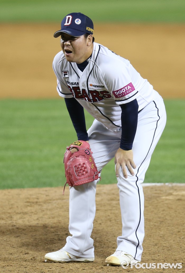 (서울=포커스뉴스) 3일 서울 잠실구장에서 열린 2016프로야구 SK-두산 경기에서 두산 마무리 투수 이현승이 9회 2사후 SK 박정권을 상대로 투구하다 발목을 다쳐 고통을 참으며 얼굴을 찡그리고 있다.