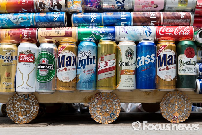 (서울=포커스뉴스) 4일 오후 서울 마포구 연남동 경의선 숲길에서 시민들이 버려진 음료캔으로 경의선 화물기차를 만들고 있다.