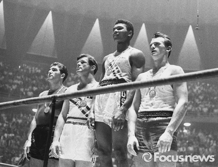 The winners of the 1960 Olympic medals for light heavyweight boxing on the winners' podium at Rome: Cassius Clay (now Muhammad Ali) (C), gold; Zbigniew Pietrzykowski of Poland (R), silver; and Giulio Saraudi (Italy) and Anthony Madigan (Australia), joint bronze.(Photo by Central Press/Getty Images)