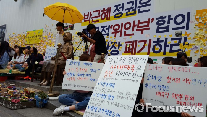 (서울=포커스뉴스) 박주민 더불어민주당 의원이 '위안부 소녀상' 앞에서 정부에 "한일 위안부 합의 내용을 밝힐 것"을 요구했다.
