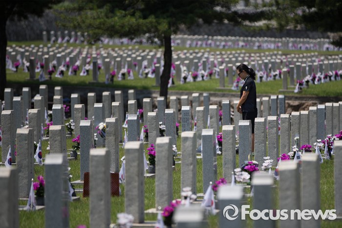 (서울=포커스뉴스) 현충일을 하루 앞둔 5일 오전 서울 동작구 국립서울현충원을 찾은 유족들이 묘역에 참배하고 있다.