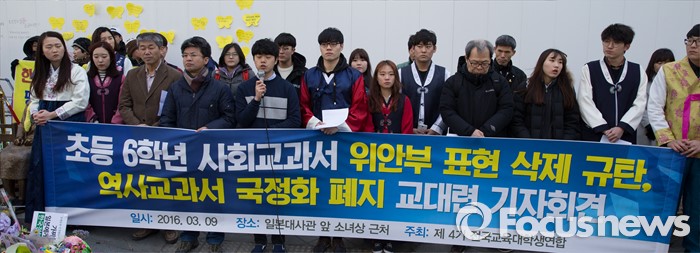 교대련은 이날 20대 국회에 △국정교과서 폐기·공교육 정상화 관련 공약 이행 △중앙 정부 차원의 누리과정 및 교육예산 편성 추진 △합리적 교사수급정책 수립 위한 노력 등을 요구했다.전국교육대학생연합이 5일 서울 영등포구 국회의사당 앞에서 기자회견을 열고 20대 국회를 향해 '국정교과서 폐기', '누리과정 예산 전가 금지' 등을 요구했다. 사진은 교대련이 지난 3월 9일 서울 종로구 일본대사관 맞은편에서 개최한 '초등 6학년 사회교과서 위안부 표현 삭제 규탄, 역사교과서 국정화 폐지 기자회견'의 모습. 2016.03.09 조종원 기자