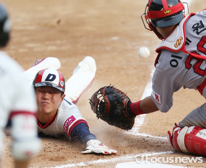 (서울=포커스뉴스) 5일 서울 잠실구장에서 열린 2016프로야구 SK-두산 경기 2회말 2사 1루에서 두산 허경민의 좌익수 왼쪽에 떨어지는 2루타때 1루주자 류지혁이 홈에서 슬라이딩하며 세이프되고 있다.
