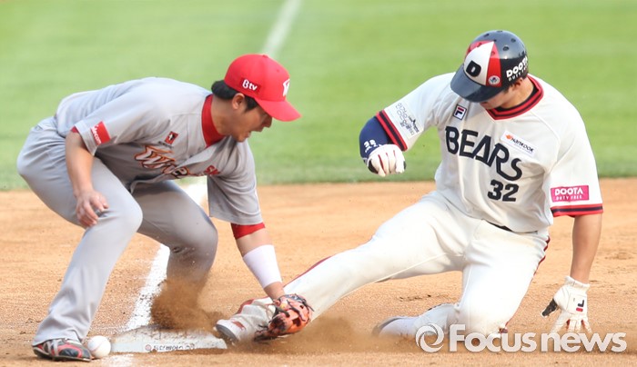(서울=포커스뉴스) 5일 서울 잠실구장에서 열린 2016프로야구 SK-두산 경기 3회말 2루타를 치고 진루한 두산 김재환이 에반스 타석때 3루 도루를 시도해 세이프되고 있다. SK 3루수는 최정.