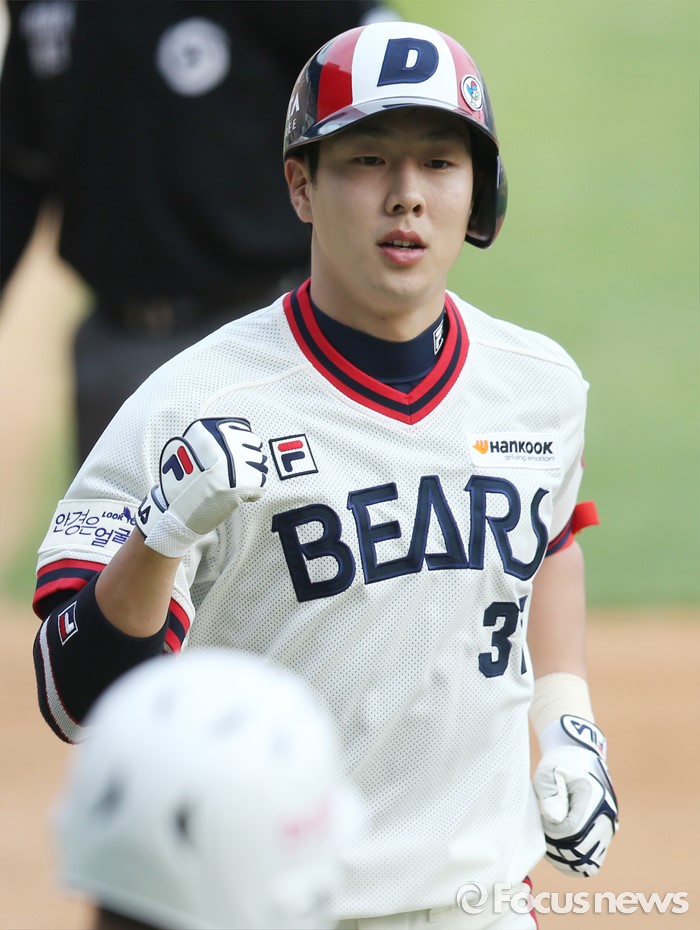 (서울=포커스뉴스) 5일 서울 잠실구장에서 열린 2016프로야구 SK-두산 경기 3회말 두산 선두타자 박건우가 좌월 솔로 홈런을 치고 주먹을 불끈 쥐며 홈인하고 있다.