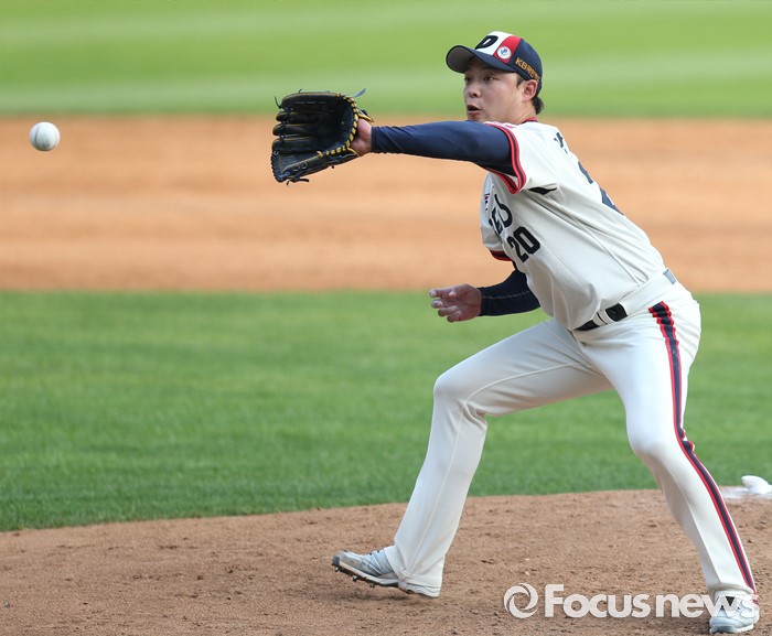(서울=포커스뉴스) 5일 서울 잠실구장에서 열린 2016프로야구 SK-두산 경기에서 두산 투수 안규영이 4회초 1사 1루에서 SK 정의윤의 타구를 잡고 있다.