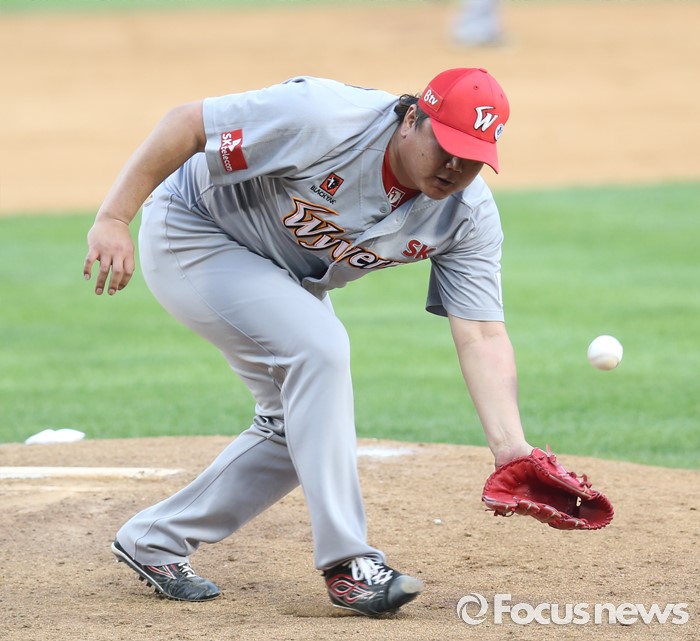 (서울=포커스뉴스) 5일 서울 잠실구장에서 열린 2016프로야구 SK-두산 경기 7회말 SK 투수 채병용이 두산 류지혁의 땅볼 타구를 잡다 놓치고 있다.
