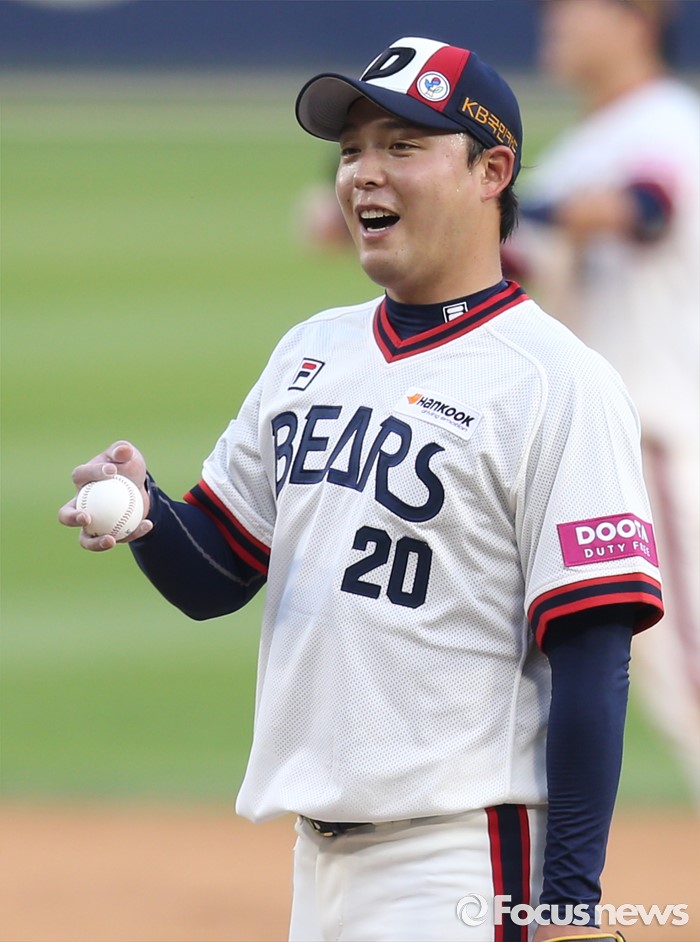 (서울=포커스뉴스) 5일 서울 잠실구장에서 열린 2016프로야구 SK-두산 경기 7회 무사 1루에서 두산 투수 안규영이 밝은 표정으로 투수 교체를 기다리고 있다.