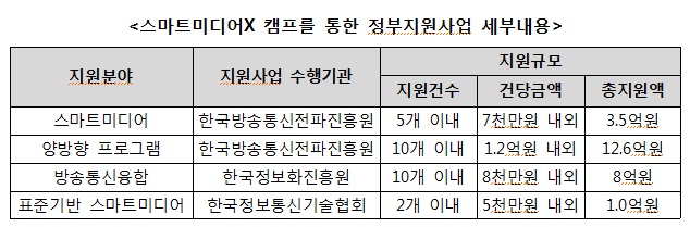 이정구 방송진흥정책국장은 “중소·벤처 개발사의 우수한 서비스를 발굴하고 아이디어 사업화를 지원하면서 글로벌 시장 진출과 일자리 창출을 유도해 스마트미디어 활성화를 위한 노력을 아끼지 않을 것”이라고 밝혔다.스마트미디어X 캠프를 통한 정부지원사업 내용.<표제공=미래부>
