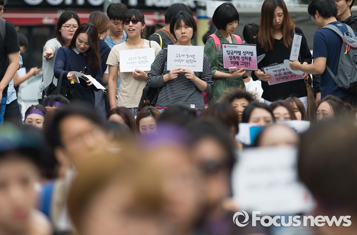 (서울=포커스뉴스) 6일 오후 서울 마포구 나루수산 앞 광장에서 열린 '여성 혐오에 저항하는 모두의 1차 공동행동-여성 혐오세상을 뒤엎자' 집회에 참석한 여성단체 회원들이 여성 혐오를 규탄하는 손팻말을 들고 있다.