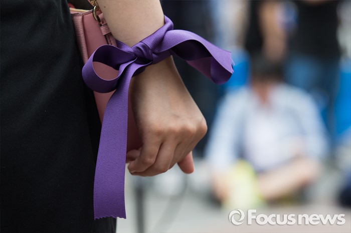 (서울=포커스뉴스) 6일 오후 서울 마포구 나루수산 앞 광장에서 열린 '여성 혐오에 저항하는 모두의 1차 공동행동-여성 혐오세상을 뒤엎자' 집회에 참석한 여성단체 회원이 손목에 보라색 리본을 매고 있다.
