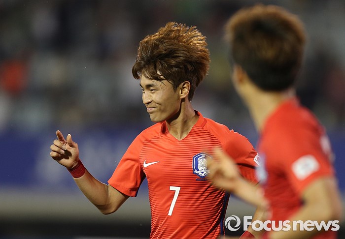 (부천=포커스뉴스) 6일 오후 경기 부천종합운동장에서 열린 2016 4개국 올림픽국가대표 축구대회 대한민국과 덴마크의 경기에서 대한민국 문창진이 선제골을 성공시킨 뒤 세레모니를 하고 있다.