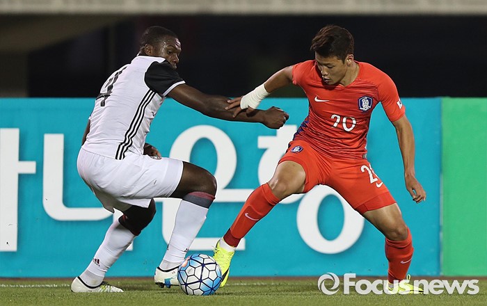 (부천=포커스뉴스) 6일 오후 경기 부천종합운동장에서 열린 2016 4개국 올림픽국가대표 축구대회 대한민국과 덴마크의 경기에서 대한민국 황희찬이 상대 선수와 볼 다툼을 하고 있다.