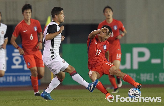 (부천=포커스뉴스) 6일 오후 경기 부천종합운동장에서 열린 2016 4개국 올림픽국가대표 축구대회 대한민국과 덴마크의 경기에서 대한민국 최경록이 상대 선수를 제치고 있다.