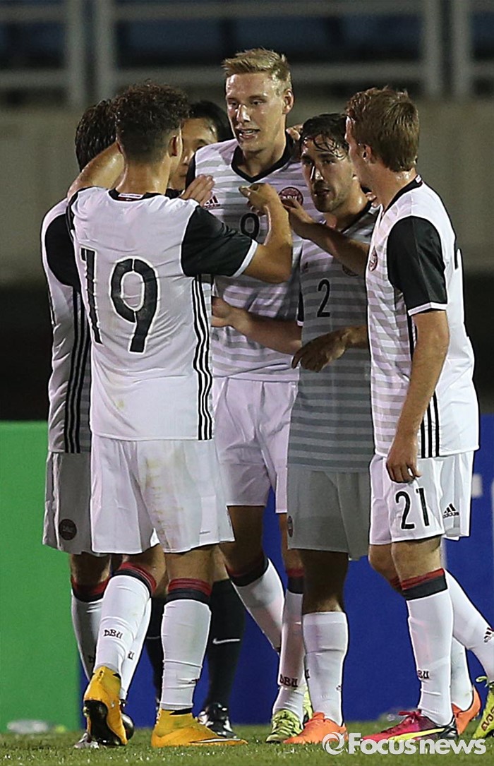 (부천=포커스뉴스) 6일 오후 경기 부천종합운동장에서 열린 2016 4개국 올림픽국가대표 축구대회 대한민국과 덴마크의 경기에서 덴마크 니콜라이 복메슨이 동점골을 성공시킨 후 동료들과 환호하고 있다.