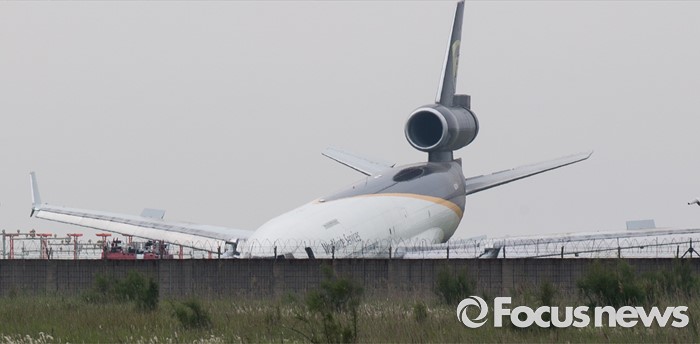 (영종도=포커스뉴스) 7일 오전 인천국제공항 활주로 부근에 UPS 소속 5X61편 화물기가 멈춰서 있다. 인천국제공항과 소방당국에 따르면 지난 6일 오후 10시 48분께 인천공항에서 미국 알래스카 앵커리지로 향할 예정이었던 화물기가 이륙 도중 바퀴가 파손돼 동체 앞 부분이 활주로를 부딪친 채 이동, 이륙에 실패했다고 밝혔다. 사고 직후 화물기에 탑승했던 조종사와 승무원 등 4명 모두 무사히 탈출한 것으로 알려졌다.