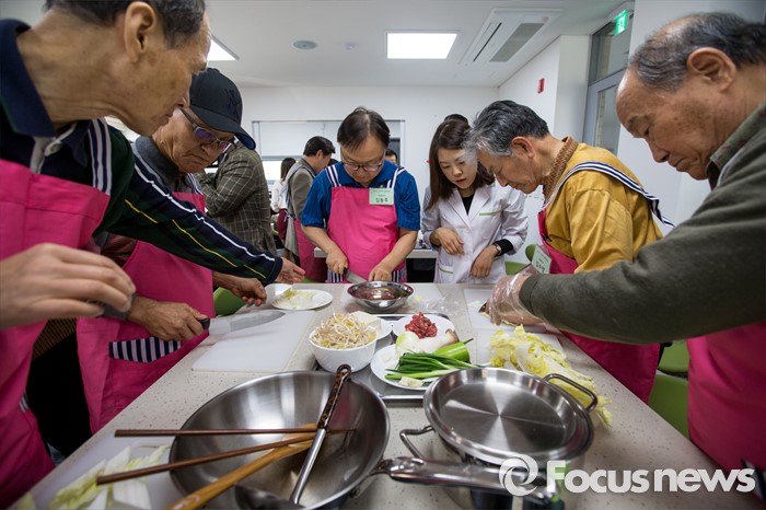 이밖에도 조리한 음식은 상온에 2시간 이상 방치하지 말고 가능한 빨리 섭취해야 하며, 날로 섭취하는 채소, 과일은 깨끗이 세척해 섭취해야 한다.(서울=포커스뉴스) 6일 오전 서울 양천구 목동보건지소에서 열린 남성시니어 영양교실에서 참가자들이 요리를 만들고 있다. 2015.11.06 강진형 기자