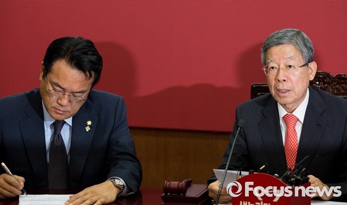 (서울=포커스뉴스) 김희옥(오른쪽) 새누리당 혁신비상대책위원장이 7일 오전 서울 여의도 새누리당사에서 열린 '혁신비상대책위원회의'에 참석해 모두벌언 하고 있다.