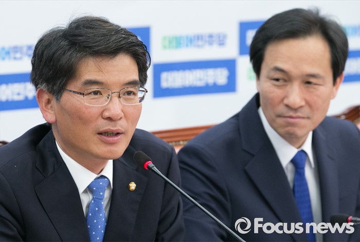 (서울=포커스뉴스) 7일 오전 서울 여의도 국회에서 열린 더불어민주당 원내대책회의에 참석한 박완주 원내수석부대표가 발언하고 있다. 오른쪽은 우상호 원내대표.