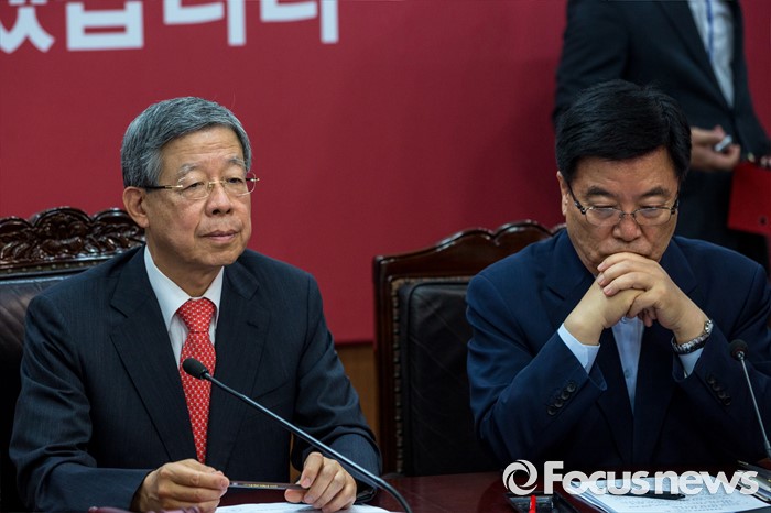 (서울=포커스뉴스) 김희옥(왼쪽) 새누리당 혁신비상대책위원장과 김광림 새누리당 정책위의장이 7일 오전 서울 여의도 새누리당사에서 열린 '혁신비상대책위원회의'에 참석해 모두발언을 마친 뒤 생각에 잠겨 있다.