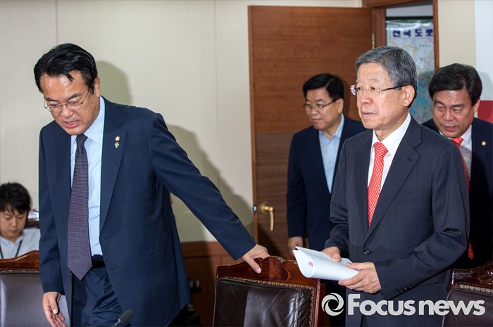 (서울=포커스뉴스) 김희옥(오른쪽) 새누리당 혁신비상대책위원장과 정진석 새누리당 원내대표가 7일 오전 서울 여의도 새누리당사에서 열린 '혁신비상대책위원회의'에 참석하기 위해 회의실로 들어서고 있다.