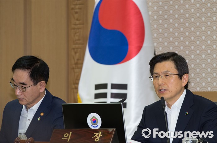 (세종=포커스뉴스) 황교안 국무총리가 7일 오전 세종시 정부세종청사 국무회의장에서 열린 서울-세종 영상 국무회의에서 모두발언을 하고 있다. 왼쪽은 이준식 사회부총리 겸 교육부장관.