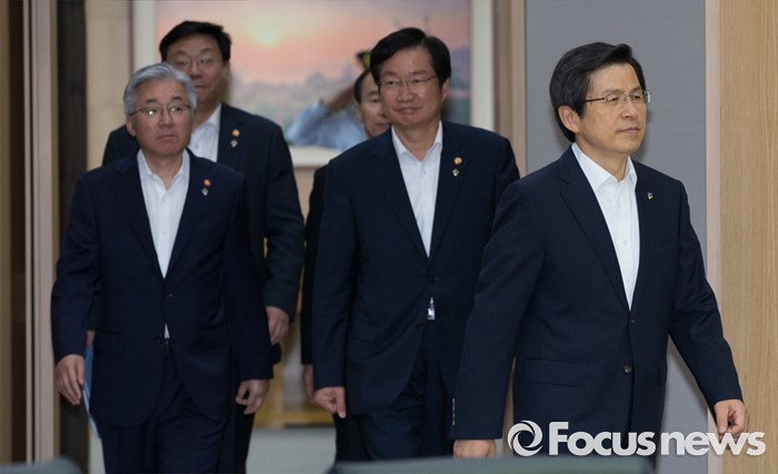 (세종=포커스뉴스) 황교안(오른쪽) 국무총리가 7일 오전 세종시 정부세종청사 국무회의장에서 열린 서울-세종 영상 국무회의에 입장하고 있다.