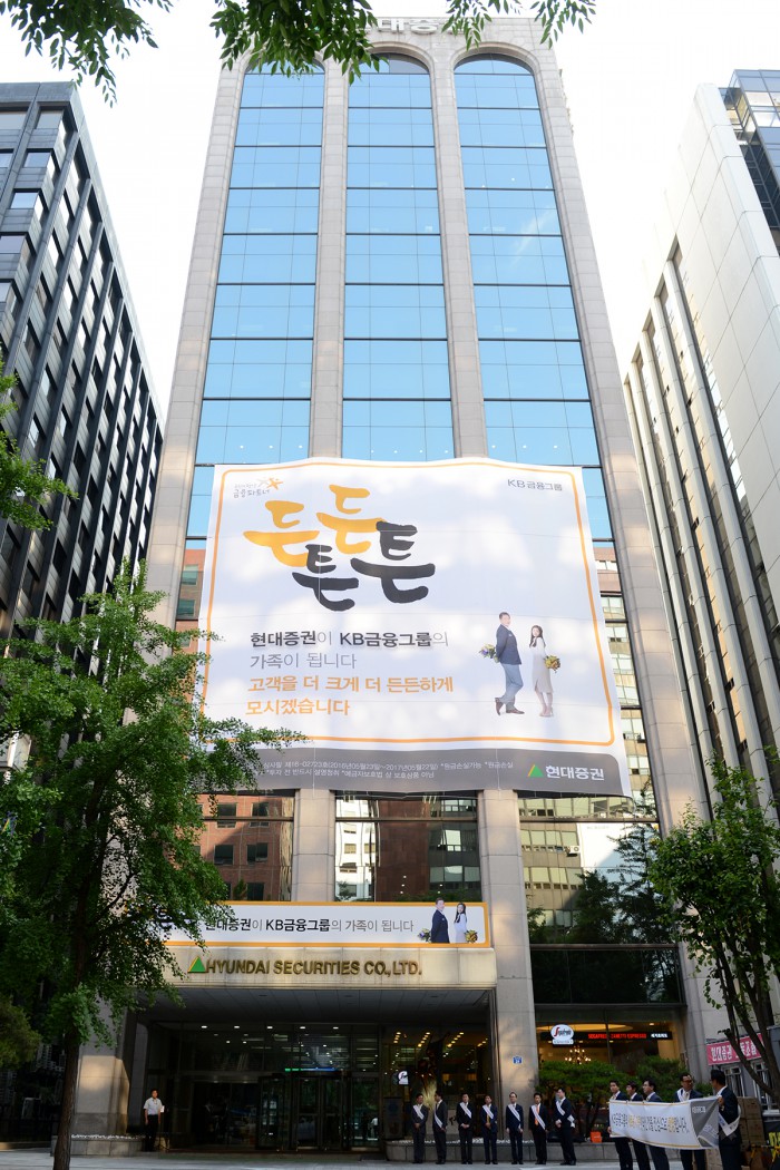 윤종규 KB금융 회장은 "양사 합병 시 강력한 투자은행(IB)이 탄생할 것으로 내다본다"며 "280만명의 현대증권 고객을 포함해 3500만명에 이르는 KB금융의 고객 기반은 타 지주사에 비해 월등이 앞서게 된다. 1등 KB전략에 속도를 낼 것"이라고 말했다.현대증권의 사옥.<사진제공=KB금융그룹>