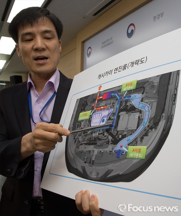 (세종=포커스뉴스) 홍동곤 환경부 교통환경과장이 7일 오전 세종시 정부세종청사 환경부 기자실에서 닛산 캐시카이 엔진룸 개략도를 보이며 엔진배기온도에 따른 배출가스 장치 작동여부에 대해 설명하고 있다.