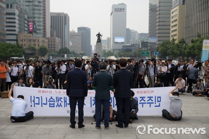 (서울=포커스뉴스) 7일 오전 서울 종로구 광화문광장에서 염태영(왼쪽부터) 수원시장, 채인석 화성시장, 이재명 성남시장이 정부의 지방재정개편안에 반대하는 단식농성 기자회견을 열고 있다.