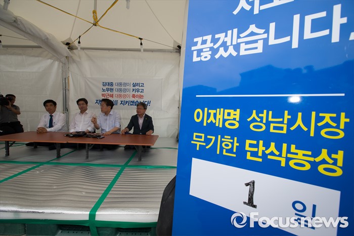 (서울=포커스뉴스) 7일 오전 서울 종로구 광화문광장에서 김병욱(왼쪽부터) 더불어민주당 의원(분당을), 염태영 수원시장, 이재명 성남시장, 채인석 화성시장이 정부의 지방재정개편안에 반대하는 단식농성 기자회견을 마친 뒤 단식농성을 시작해 기자들의 질문을 받고 있다.