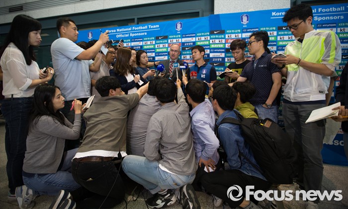 (인천공항=포커스뉴스) 유럽 원정에 나서 두 차례 평가전을 치러 1승 1패(스페인 1-6패, 체코 2-1승)를 거둔 대한민국 축구 국가대표팀 슈틸리케 감독이 7일 오후 인천국제공항을 통해 귀국 후 취재진 질문에 답하고 있다.