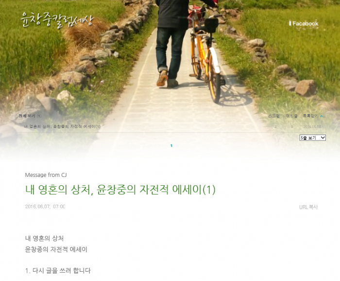 그는 매주 월요일~금요일 아침 7시에 '내 영혼의 상처-윤창중의 자전적 에세이'를 블로그에 연재할 예정이다.윤창중 블로그 '윤창중칼럼세상' 캡쳐 화면. 2016.06.07 류연정 기자 j4837415@focus.co.kr