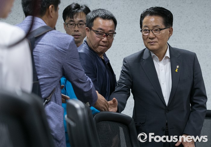(서울=포커스뉴스) 박지원 국민의당 원내대표가 7일 오후 서울 여의도 국회 의원회관에서 세월호 특별법 개정안과 관련 전명선 4·16가족협의회 운영위원장, 유경근 집행위원장 등 관계자들과 면담에 앞서 인사하고 있다.