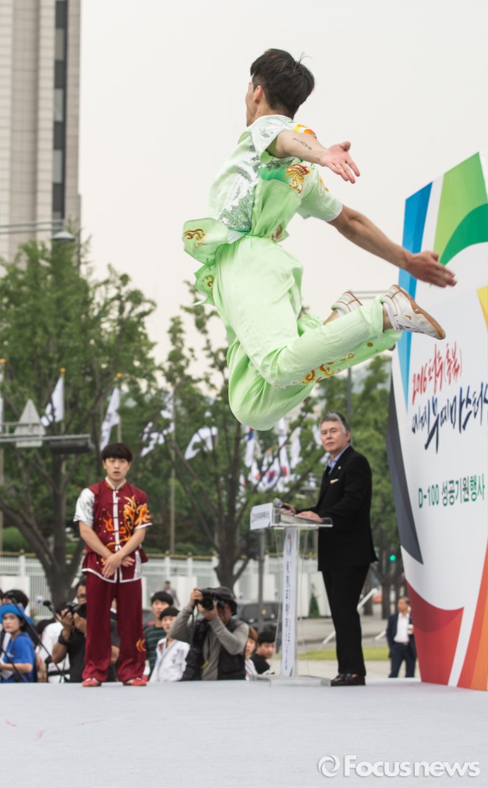 (서울=포커스뉴스) 7일 오후 서울 종로구 광화문 광장에서 열린 '2016 청주(충북) 세계무예마스터십 D-100성공기원행사'에 참여한 시범단이 우슈 동작을 선보이고 있다.