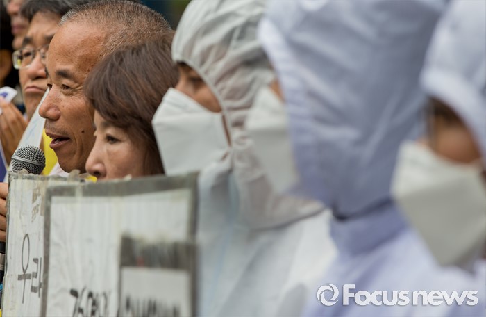 (서울=포커스뉴스) 7일 오후 서울 서초구 삼성전자 사옥 앞에서 열린 '반도체 공장 희생자들과 가습기살균제 피해자들 연대 기자회견'에서 삼성 반도체 피해자 고 황유미 씨 부친 황상기 씨가 발언하고 있다.