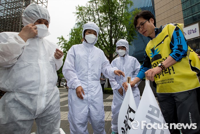 (서울=포커스뉴스) 7일 오후 서울 서초구 삼성전자 사옥 앞에서 열린 '반도체 공장 희생자들과 가습기살균제 피해자들 연대 기자회견'에서 가피모 및 반올림 회원들이 현수막을 정리하고 있다.