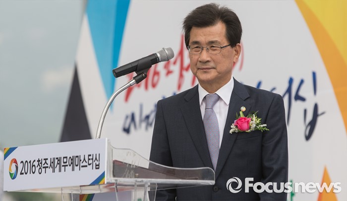 (서울=포커스뉴스) 7일 오후 서울 종로구 광화문 광장에서 열린 '2016 청주(충북) 세계무예마스터십 D-100성공기원행사'에 참여한 이시종 조직위원장이 축사를 위해 이동하고 있다.