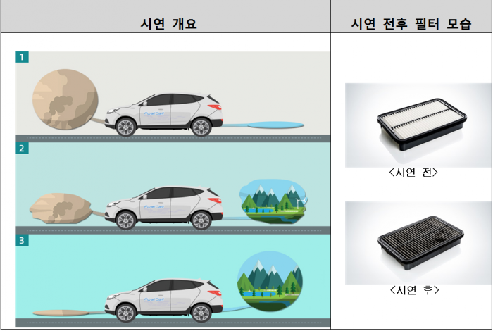 현대차는 투싼ix 수소전기차에 미세먼지가 들어 있는 애드벌룬과 속이 비어있는 애드벌룬을 차량 앞뒤에 장착한 채 실험을 진행했다. 시동을 걸자 오염된 공기는 차량 흡입구를 통해 들어온 뒤 배기구로 빠져 나가면서 청정공기로 변했다. 차량에 탑재된 연료전지 스택(수소와 산소를 반응시켜 전기와 물을 만드는 주요 장치)이 필터를 통해 공기를 정화하며, 차량 구동에 필요한 전기를 생산해냈기 때문이다.