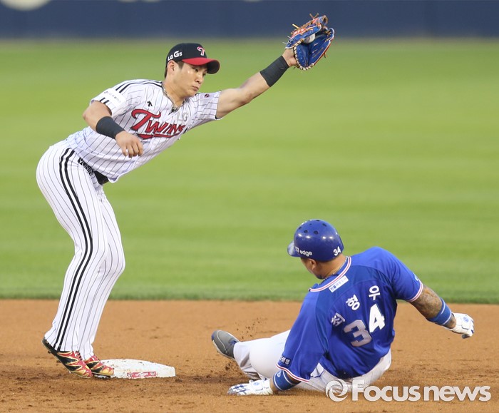 (서울=포커스뉴스) 7일 서울 잠실구장에서 열린 2016 프로야구 삼성-LG 경기 4회초 무사 1루에서 삼성 백상원의 1루 땅볼때 1루주자 최형우가 2루에서 세이프되고 있다.