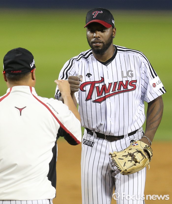 (서울=포커스뉴스) 9일 서울 잠실구장에서 열린 2016 프로야구 삼성-LG 경기에서 LG 투수 헨리 소사가 8회 1사후 안타를 맞고 투수교체를 위해 마운드에 올라가는 강상수 코치와 주먹을 마주치고 있다.