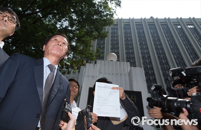 (서울=포커스뉴스) 8일 오전 서울 종로구 정부서울청사 앞에서 정기섭(왼쪽) 개성공단기업 비상대책위원회 위원장과 관계자들이 통일부에 방북 신청서 제출 전 기자회견문을 낭독하고 있다.