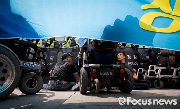 (서울=포커스뉴스) 9일 오전 서울시청 서소문별관 인근의 버스정류장에서 장애인차별철폐연대 회원들이 장애인 이동권 보장을 촉구하며 경기도행 광역버스 기습 점거시위를 벌여 경찰과 충돌하고 있다.