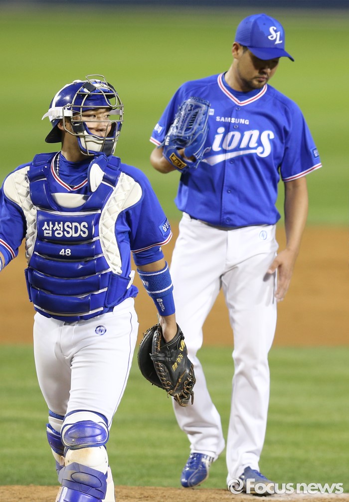 (서울=포커스뉴스) 9일 서울 잠실구장에서 열린 2016 프로야구 삼성-LG 경기 5회말 LG 유강남에게 연타석 홈런을 허용한 뒤 삼성 장원삼이 마운드에서 구수회의를 마치고 풀이 죽은 모습을 보이고 있다.