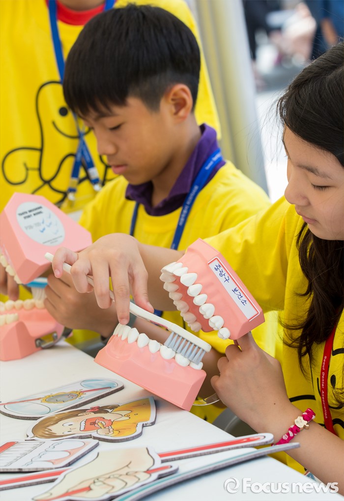 (서울=포커스뉴스) 9일 오전 서울 청계광장에서 열린 제1회 서울시민 구강보건의 날 기념행사에 참석한 어린이들이 바른 칫솔질을 배우고 있다.