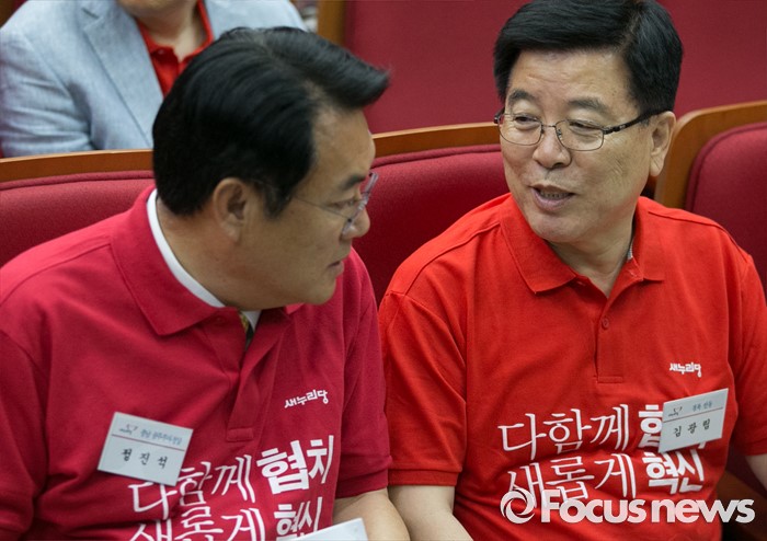 (과천=포커스뉴스) 10일 오전 경기도 과천 국가공무원인재개발원에서 열린 2016 새누리당 정책워크숍에 참석한 정진석(왼쪽) 원내대표와 김광림 정책위의장이 대화하고 있다.
