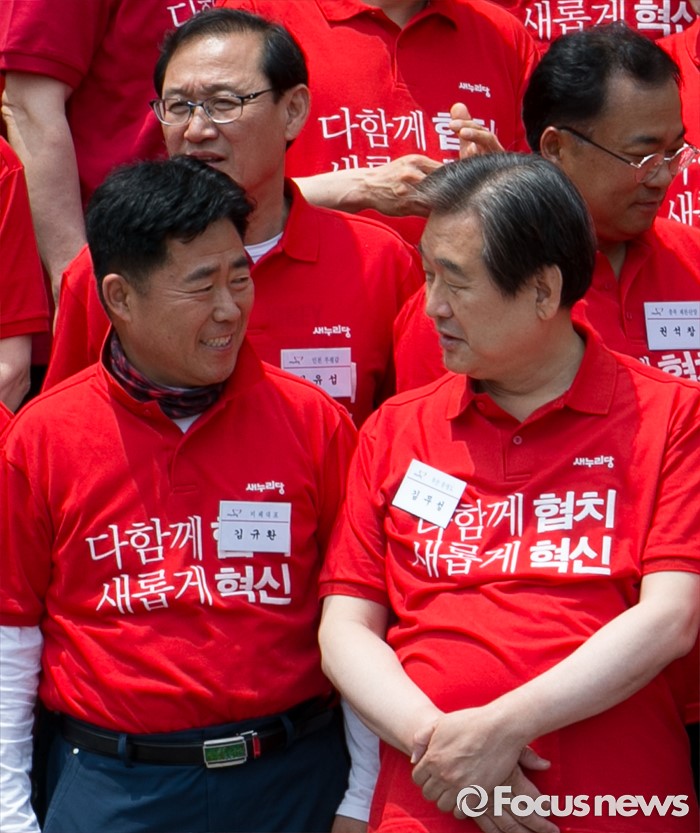 (과천=포커스뉴스) 10일 오전 경기도 과천 국가공무원인재개발원에서 열린 2016 새누리당 정책워크숍에 참석한 김무성(오른쪽) 전 대표와 김규환 의원이 대화하고 있다.